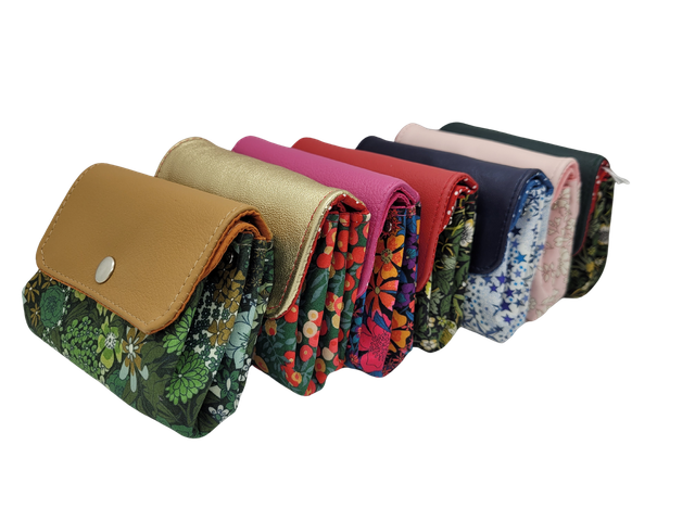 Porte monnaie en cuir de vachette bleu orage (rabat) et Liberty of London Ciara bleu et argenté (extérieur).