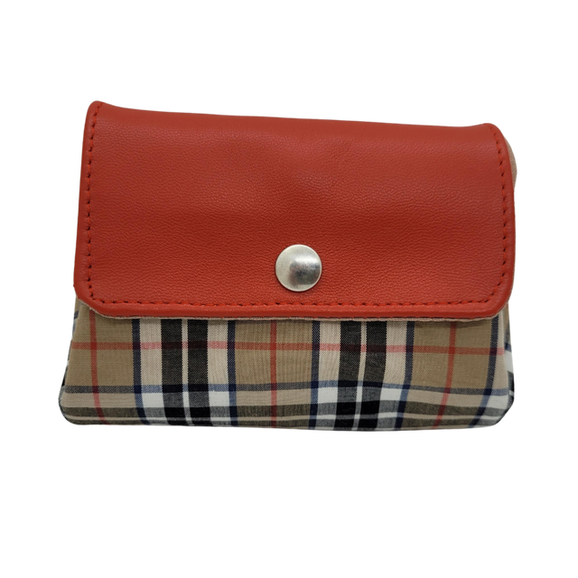 Porte monnaie en cuir d'agneau rouge (rabat) et popeline tartan (extérieur).