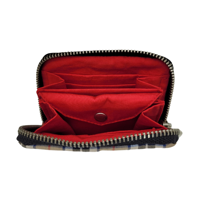 Mini portefeuille entièrement fermé par un zip en métal. En cuir d'agneau rouge popeline Tartan pour l'extérieur, et coton à l'intérieur.